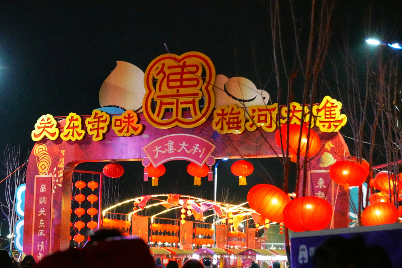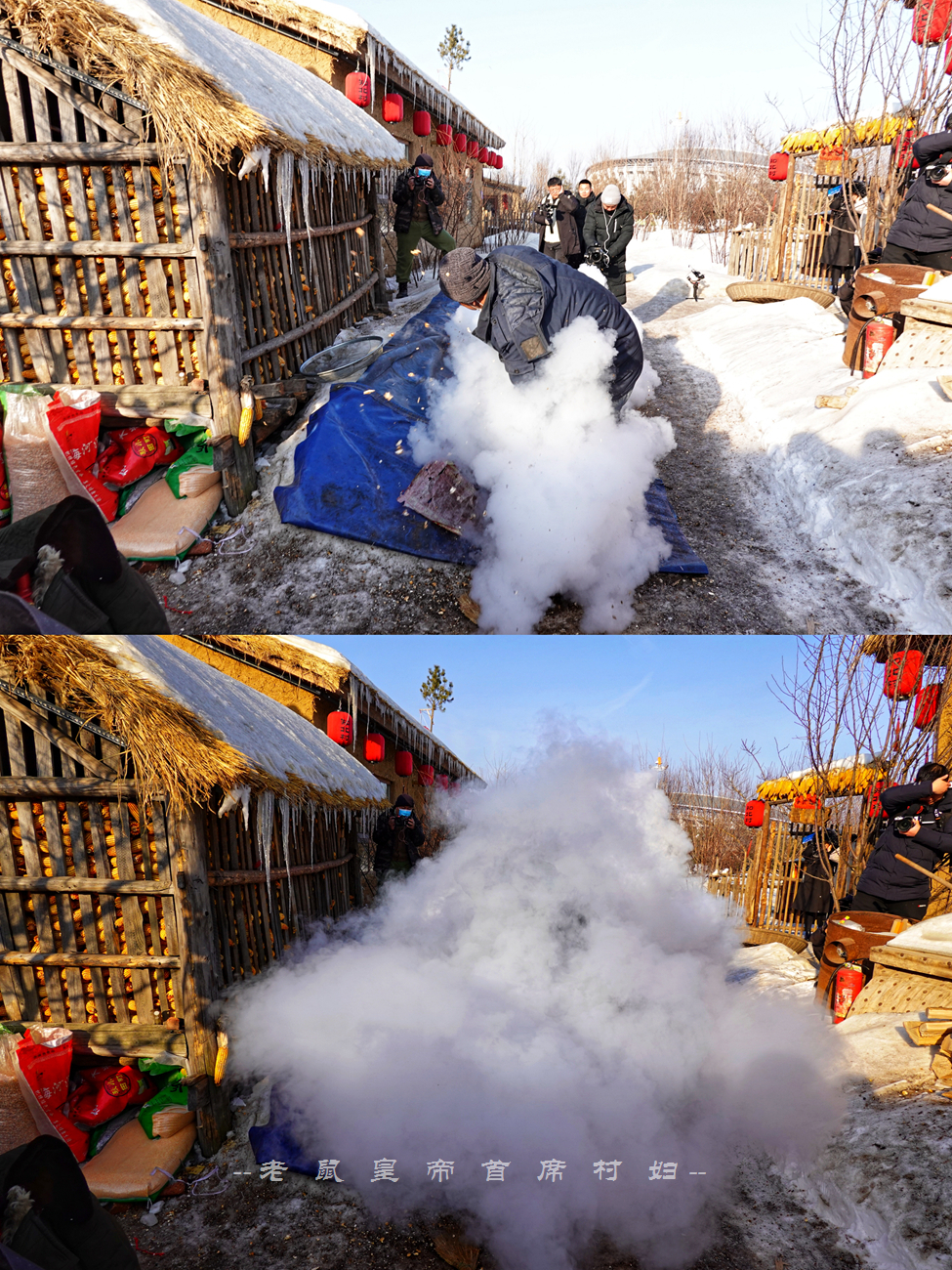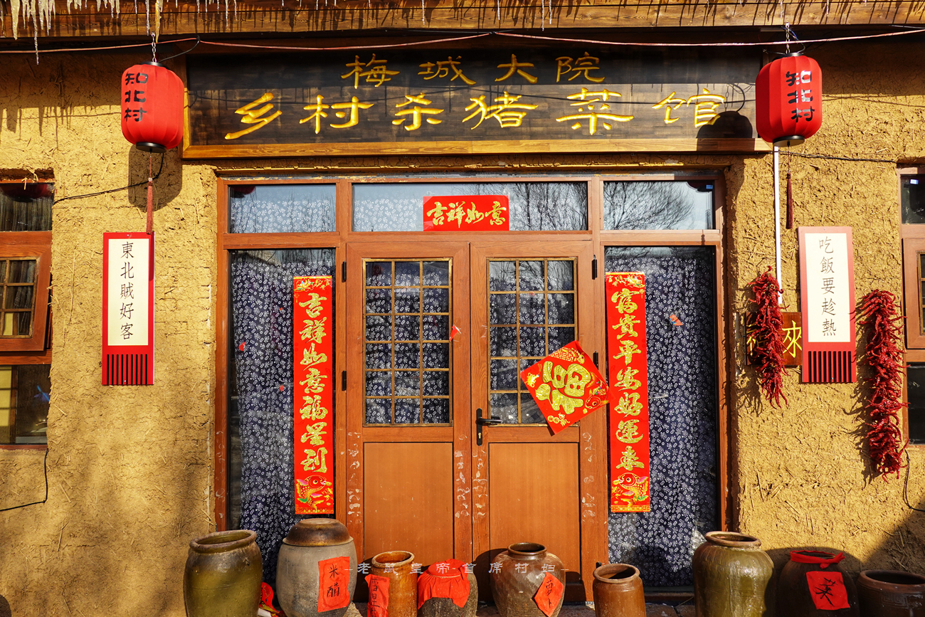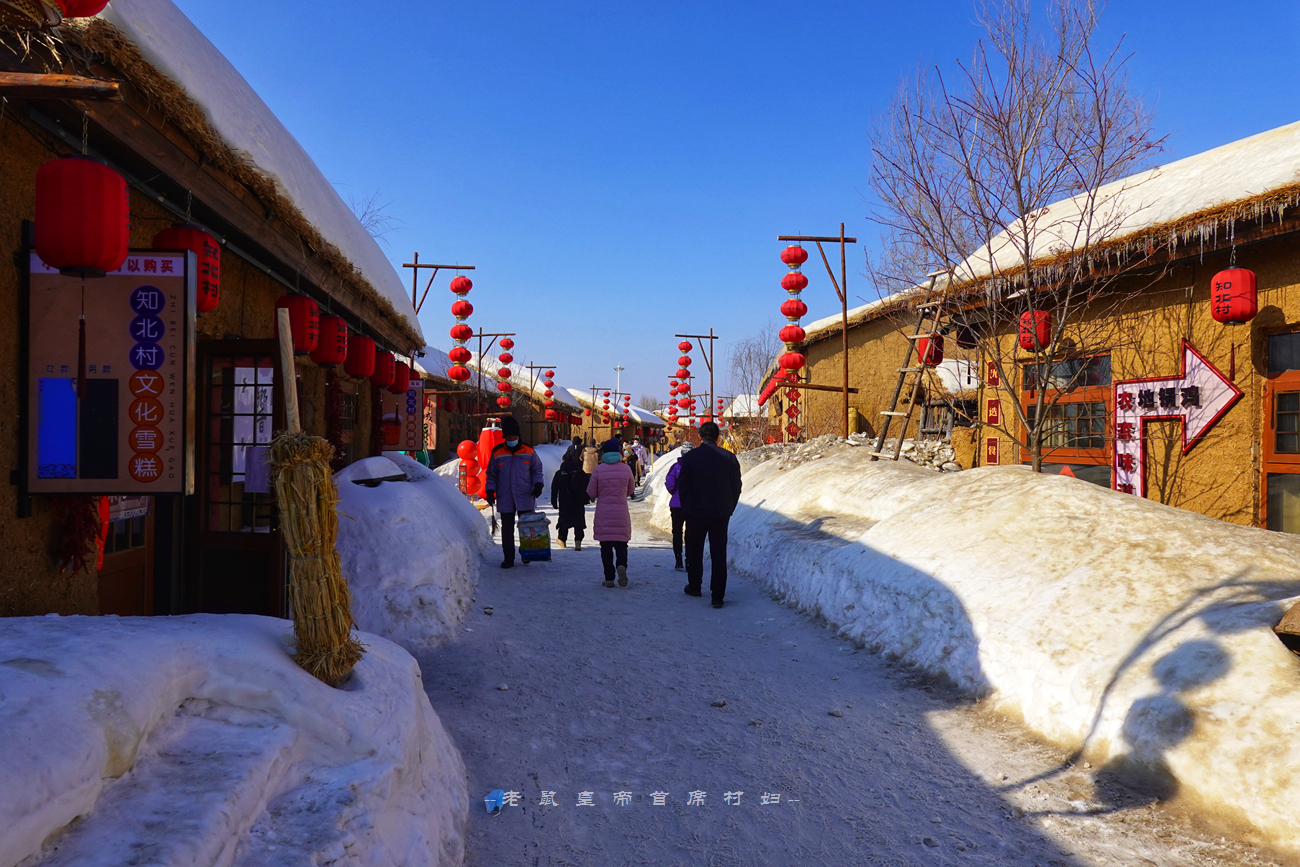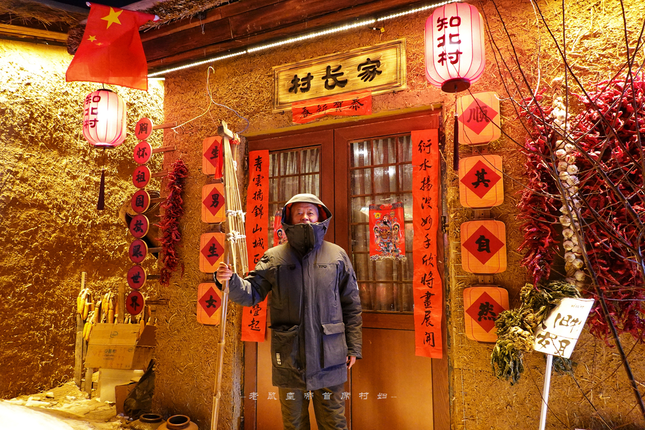 因为我们是受邀前去录制节目的,根据拍摄需要活动范围有限,主要集中在民俗商街上,在这条长约180米的街道上,两侧全部都是复古的黄泥墙茅草房,顶上覆盖着厚厚的积雪,门前大红灯笼高挂,白天看已经非常喜庆,等到夜幕降临灯笼齐亮,氛围感一下子拉满,热情奔放洒脱的东北味道藏都藏不住。