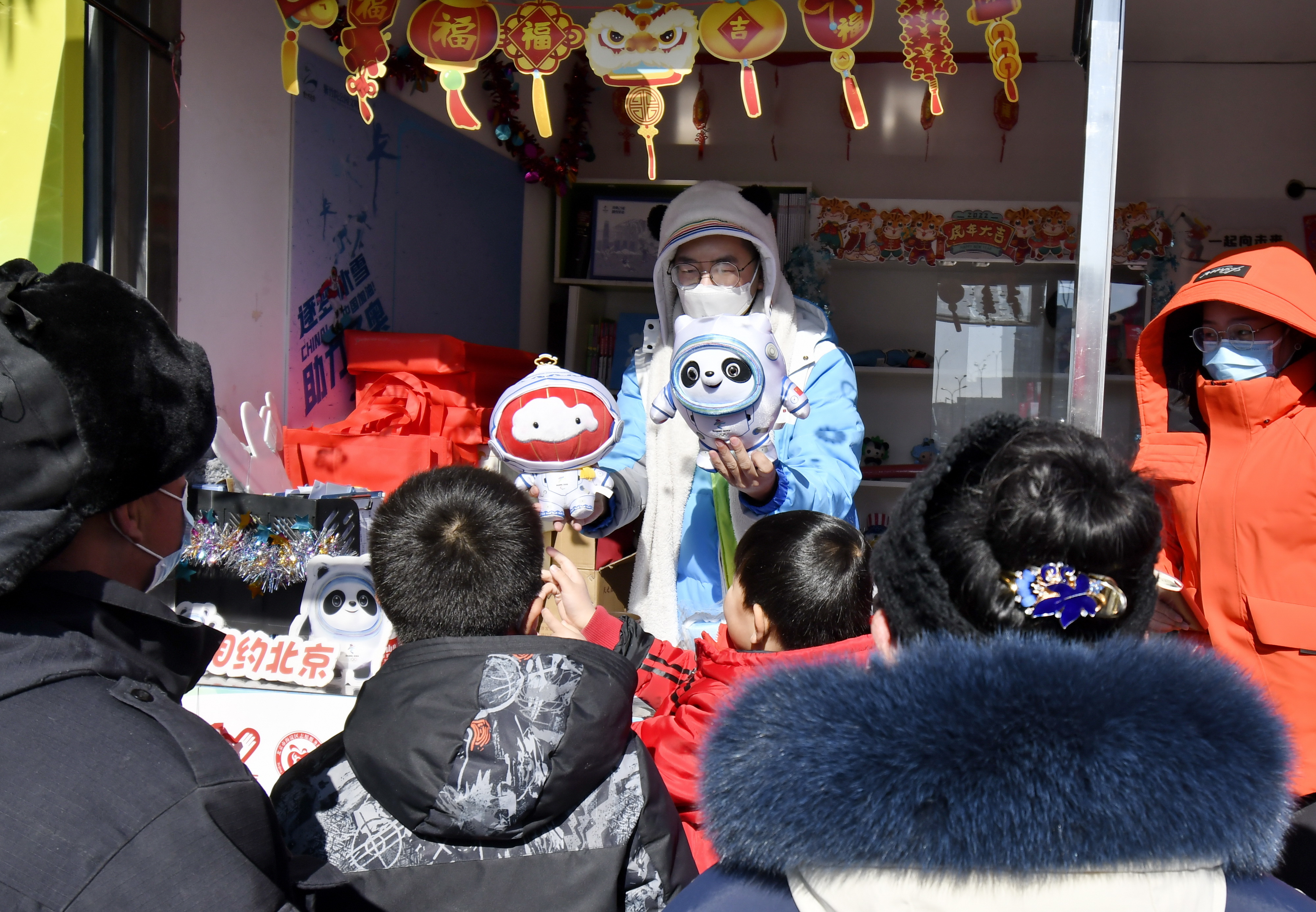 2月16日,北京冬奥会城市志愿者张文全为市民介绍冬奥会和冬残奥会吉祥物。