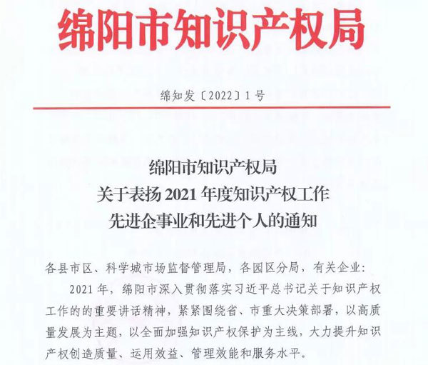 近日,绵阳市知识产权局发布“关于表扬2021年度知识产权工作先进企事业和先进个人的通知”,根据各企事业单位2021年知识产权创造、运用、保护和管理等工作开展情况,对先进单位和个人进行表彰。