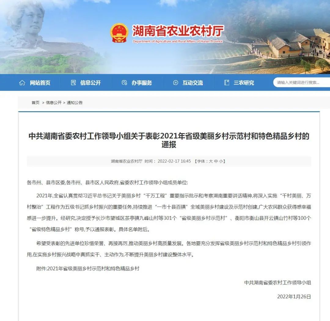 近日,湖南省农业农村厅发布中共湖南省委农村工作领导小组关于表彰2021年省级美丽乡村示范村和特色精品乡村的通报,决定授予长沙市望城区茶亭镇九峰山村等301个“省级美丽乡村示范村”、衡阳市衡山县开云镇山竹村等100个“省级特色精品乡村”称号,予以通报表彰。