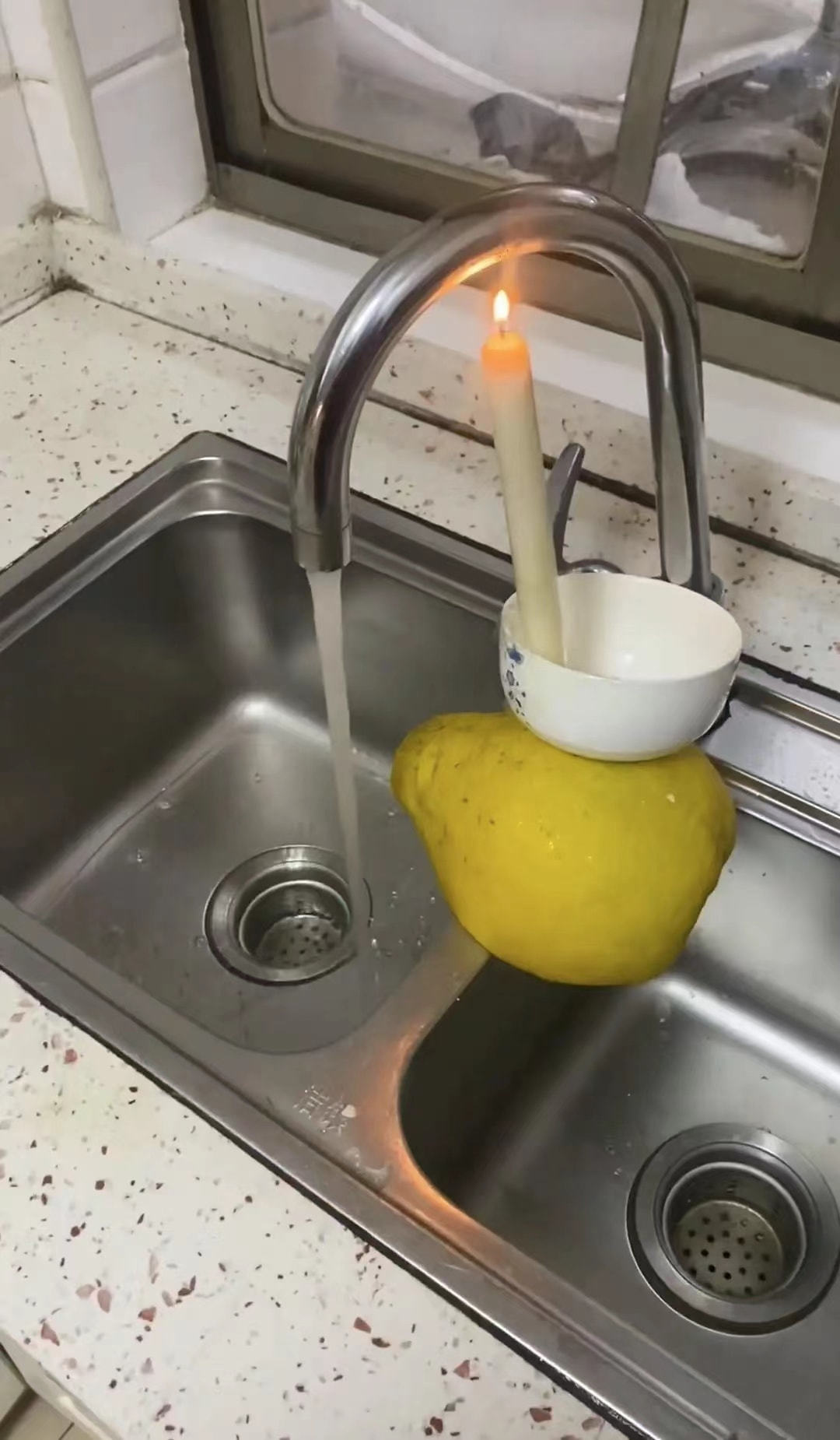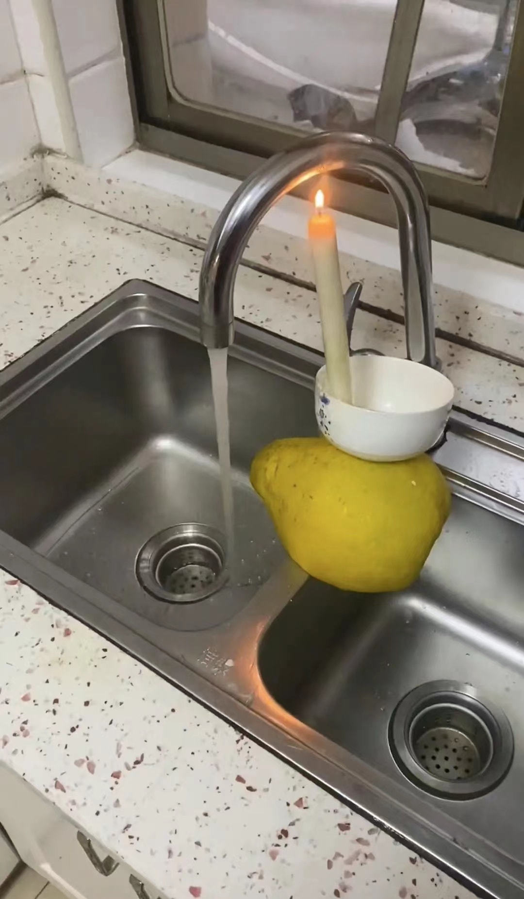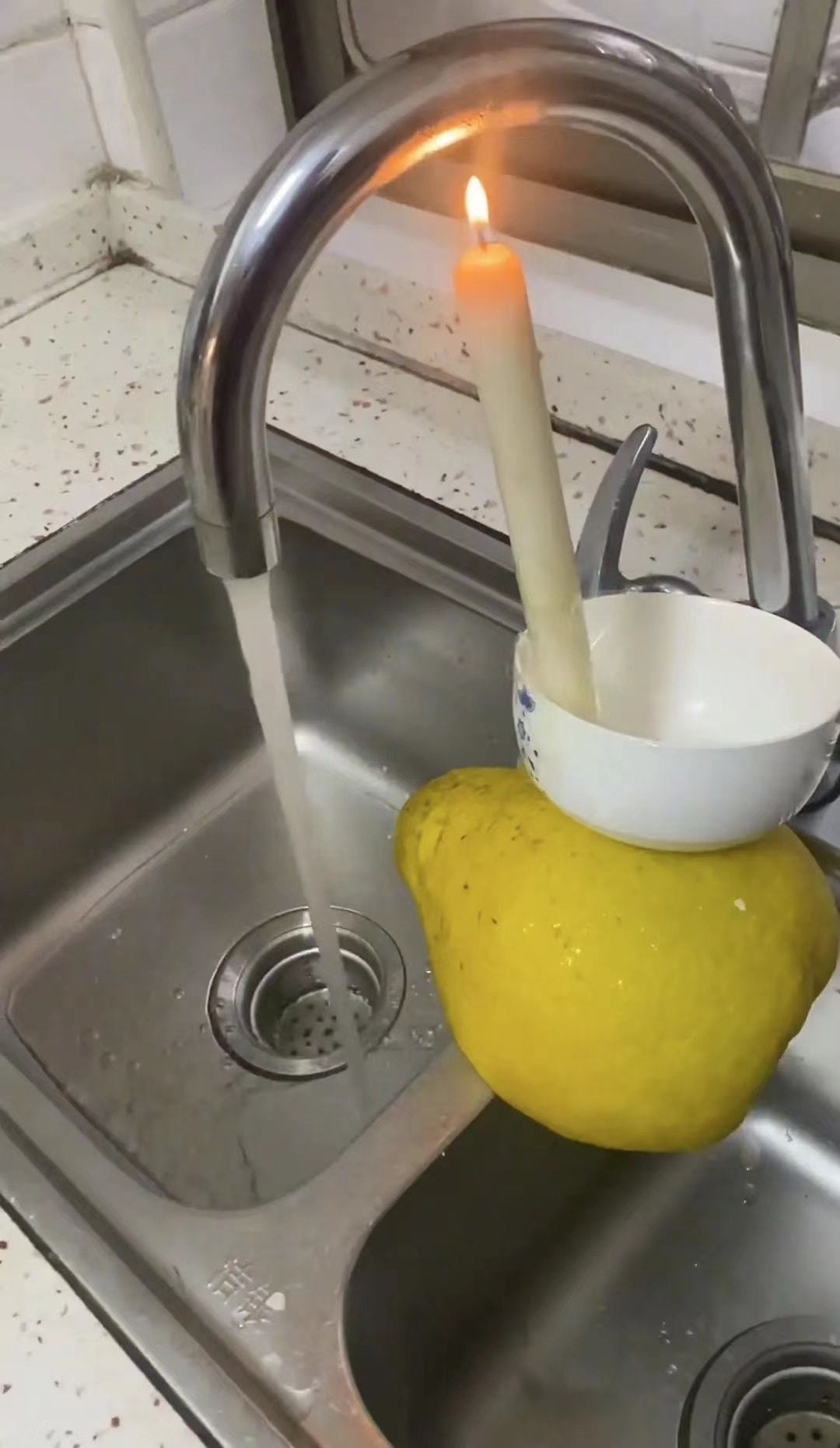 广东这位小伙正是由于自己家厨房没有按照加热装置,冬天洗碗的时候水比较冷,于是他就突发奇想,在洗碗槽的上方放置了一颗柚子,把碗的高度支撑起来,再在碗中立上一根蜡烛,蜡烛燃烧的火苗正对着水龙头的腰身位置。