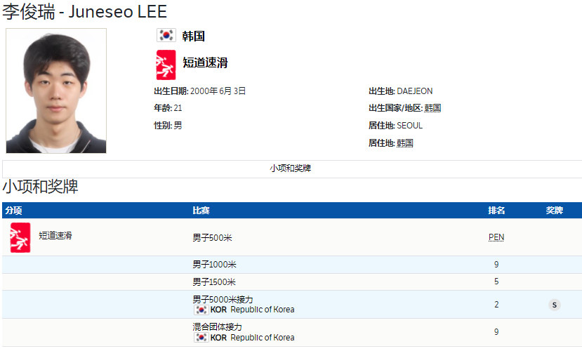 21岁的李俊瑞此前曾经拿下过国际滑联短道速滑世界杯荷兰多德雷赫特站男子1500米的亚军。来到北京冬奥会,李俊瑞在男子500米犯规没有成绩,男子1000米排名第9,男子1500米排名第5,混合团体接力排名第9。男子5000米接力的项目中,李俊瑞和队友拿下了银牌,这枚银牌也是李俊瑞在本届冬奥会的唯一收获。