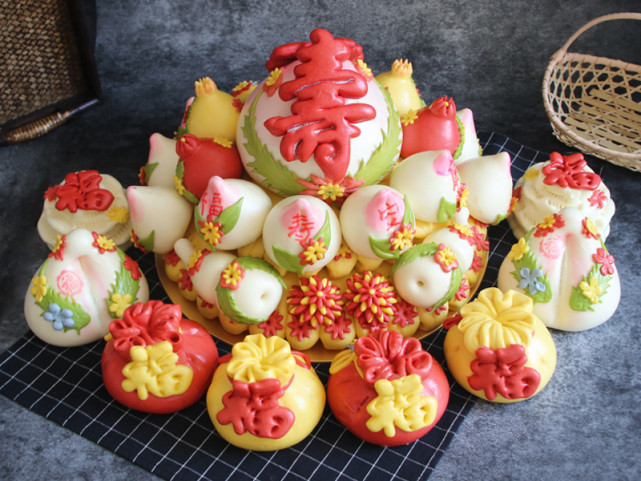 莱州婚礼习俗中,男女订婚要互送巧饽饽,男方给女方送发面做的二十个面桃,女方留下十个,然后回赠男方龙凤、鸳鸯、金鱼、狮子、佛手、蝴蝶等对数不等。这类巧饽饽体型较大,约一尺有余,上面插满了烫面做成的小型面花,称“枣花”,亦有早立子之意。结婚时,姑姑、舅舅、姨等至亲要送八个寿桃形的大饽饽,上面插满了鸳鸯戏水、喜鹊闹梅、八仙庆寿、比翼双燕等。结婚时娘家要做一对鱼、一对富贵,象征富贵有余,一对鸳鸯,象征着恩恩爱爱、白头到老,鸳鸯用红线系在一起放在脸盆里,寓意终生相随。鸳鸯在婚后让女婿食用,面鱼、包子、富贵要在回娘家时每样带回一个。而盖新房上梁时为求上梁大吉,要供奉圣虫、龙凤呈祥、狮子把门等面花,以象征家业兴旺。此外,还要蒸制上百个花样不同的小饽饽,在上梁时撒给乡亲。撒完饽饽,上梁仪式便宣告结束。有的木匠、瓦匠不会唱喜歌,东家则要请专门唱喜歌的,唱喜歌的一定是口齿伶俐、能说会道之人。唱喜歌时可以根据东家的情况编一些令人逗笑的词句,围观的人也必定是笑声不断。当天中午,东家摆上丰盛的上梁酒宴,款待所有工匠宾朋,大家为新房的即将落成共同庆贺,气氛喜庆热闹。