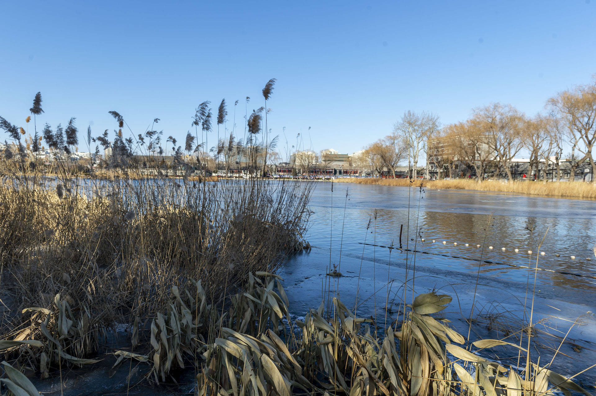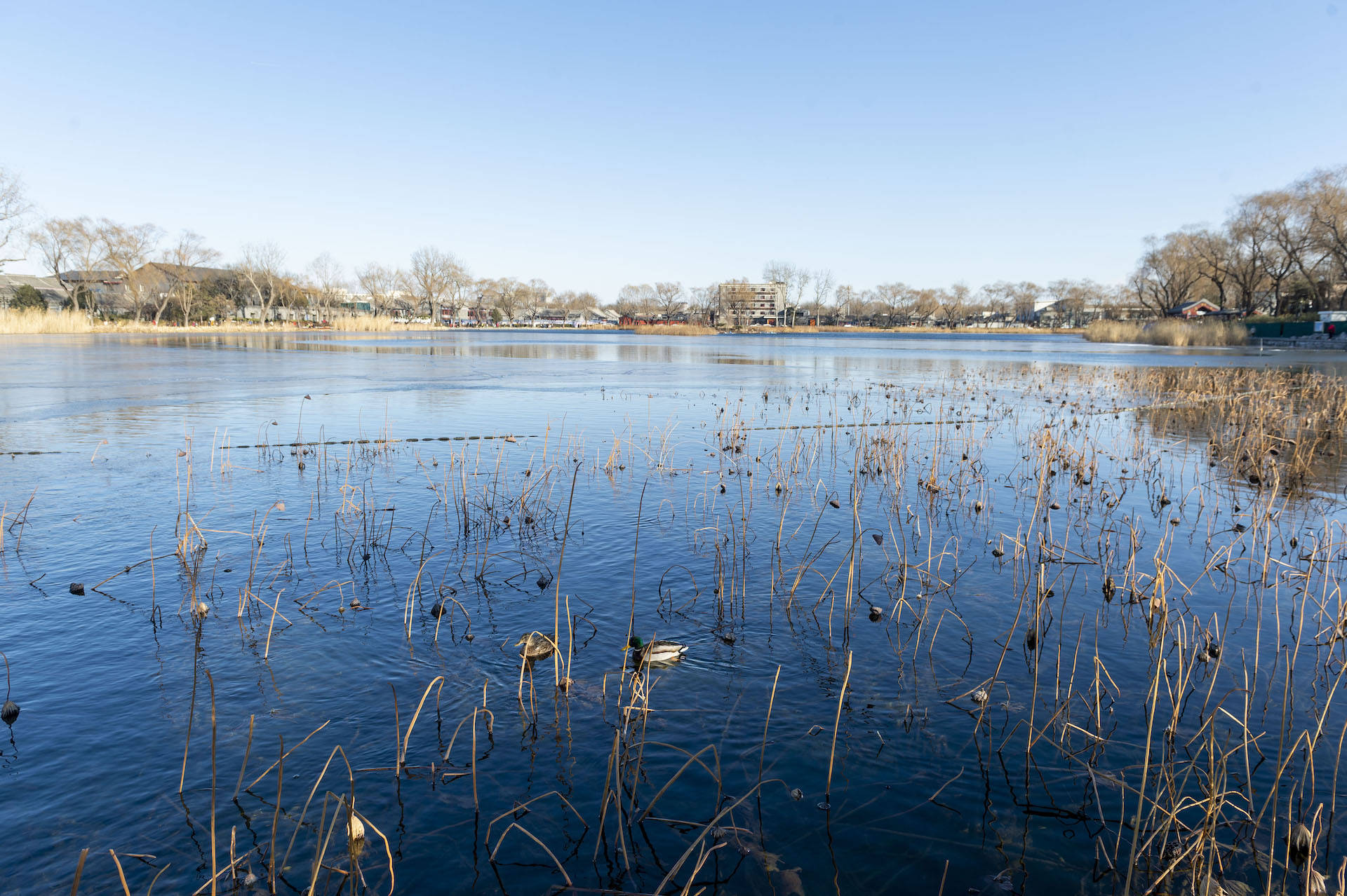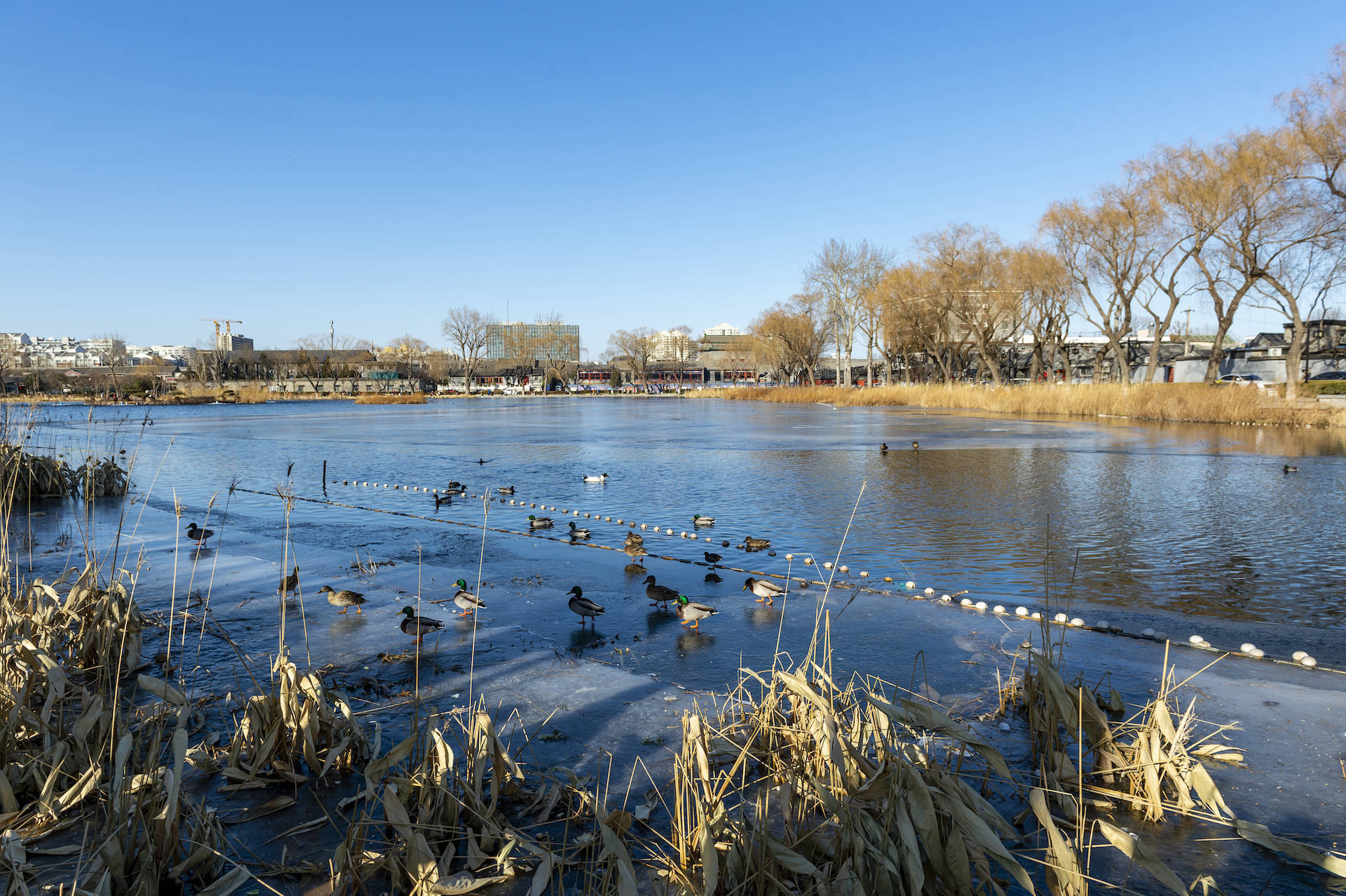 西海与前海、后海合称为“后三海”,现在这里是一片湿地公园,面积也不算小。初春时节,积雪未消,残冰还漂浮在水面上,芦苇还是枯黄的颜色,但“春江水暖鸭先知”,成群的野鸭已经在湛蓝的湖水中游弋了——这是春天的气息。