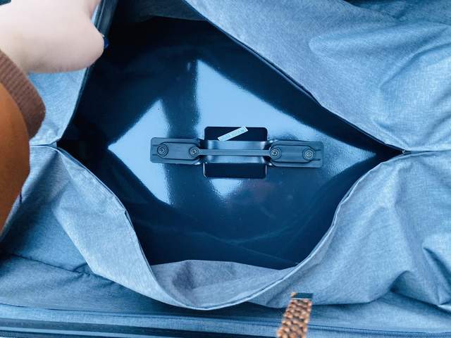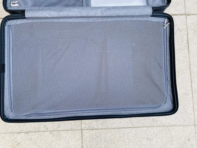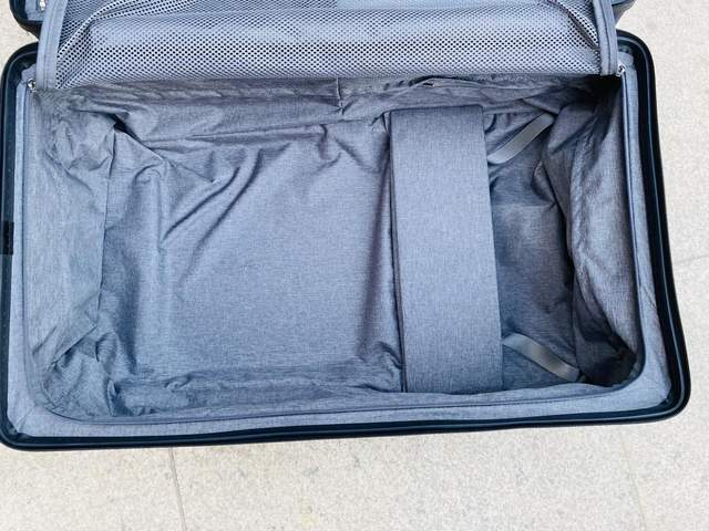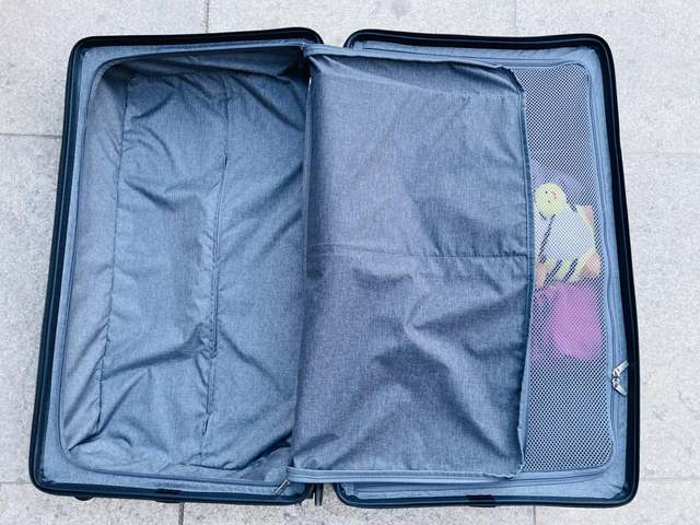 拉开拉链可以看到内侧深度还是比较深的,没有常规行李箱拉杆占用,空间特别的宽敞,平时冬天穿的大件羽绒服都可轻松装入,里边的内衬是涤纶材质,特别的光滑、舒适、耐用。内部还简单做了“档板”分区设计,需要档板时可以立起,不用时可以将其放平,特别人性化的设计。