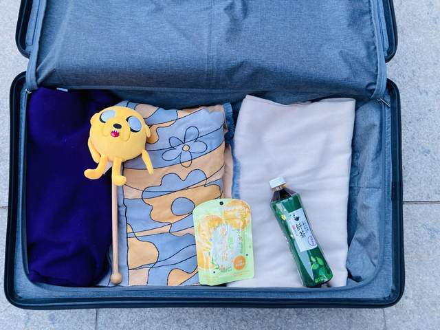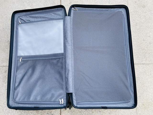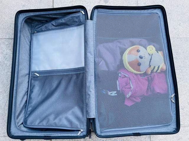 箱身左侧双拉链拉看后,也有一个略大的小空间,可以摆放一些随身小衣物、零食、相机等。