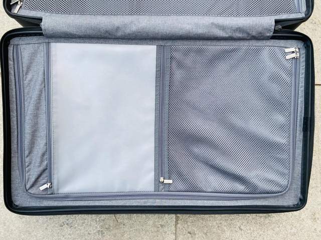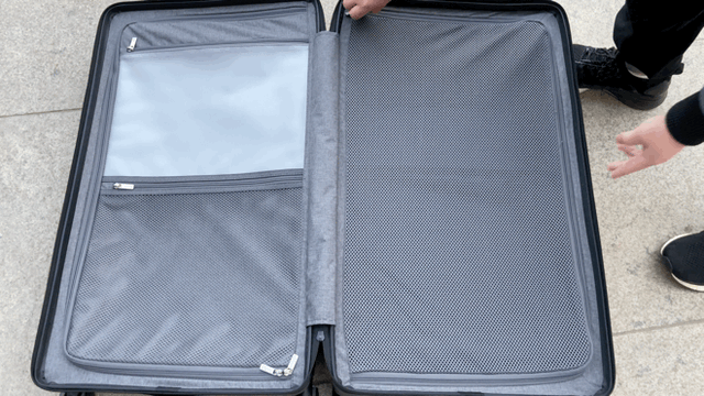 箱身右侧是大件放置区,有一个大的可透视网布设计,平时放的物品不拉链的情况下也能大致了解放的什么。