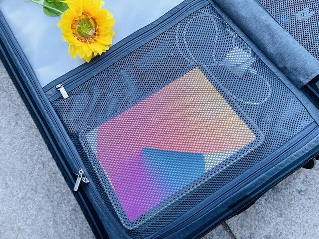 PVC拉链袋下方的网格袋我会放平板、移动电源、充电线、耳机等一些数码产品,也可以根据个人出行需要放一些随身物品,开箱拿取很方便。