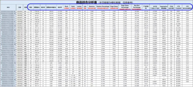 以核心商品的数据分析为例,重点关注数据如下表(某大卖的商品综合分析报表案例):