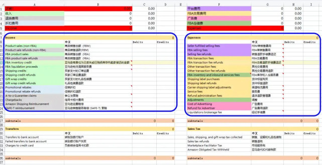 传统常规的做账方法:先从亚马逊后台导出店铺Summary账单,手动输入到Excel表格当中;然后将lncome和Expenses大类下的费用明细用不同颜色进行标记,进一步进行费用划分,并且将相同颜色的费用相加后,得出新的费用指标。