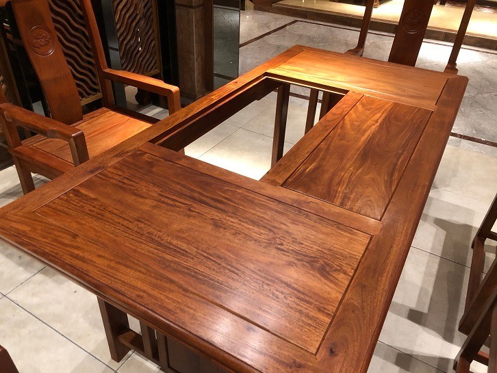 八仙桌的得名和我国古代神话有关,八仙齐聚一堂,共同进餐。红木八仙桌的桌面比较大,会首入人的眼球,所以桌面光滑,透亮很十分必要的,质感也要平整均匀,这对工艺的要求极高,俗话说简单也复杂,虽然只是一块桌面,但这也彰显工艺的精和巧。牙板的图案会凸显风格雅致,桌腿的弯曲和花雕,更显示线条的美感。