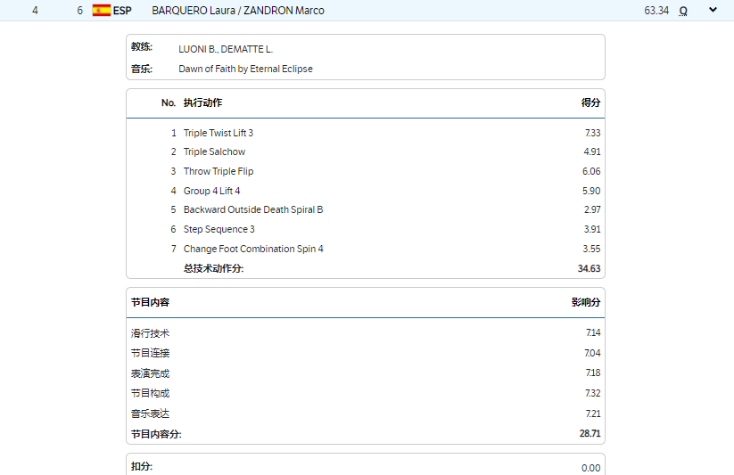 第6组出场的西班牙组合马尔科-桑德龙和巴尔克罗的表演曲目是Eternal Eclipse的《Dawn of Faith》,他们的执行动作得到34.63分,节目内容得到28.71分,总分63.34分,暂时排名第4。