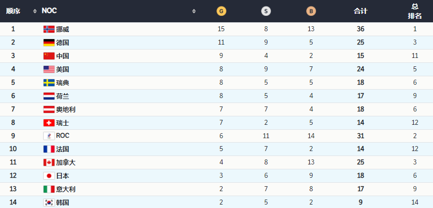 当然,奖牌榜,更看重金牌数,因此,中国队高居第3,仅次于挪威和德国。