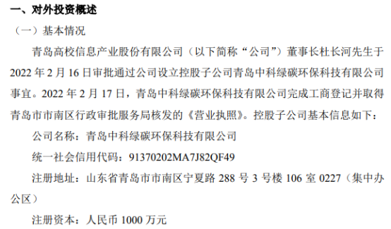 挖贝网2月18日,高信股份(870805)近日发布公告,青岛高校信息产业股份有限公司(以下简称“公司”)董事长杜长河于2022年2月16日审批通过公司设立控股子公司青岛中科绿碳环保科技有限公司事宜。2022年2月17日,青岛中科绿碳环保科技有限公司完成工商登记并取得青岛市市南区行政审批服务局核发的《营业执照》。