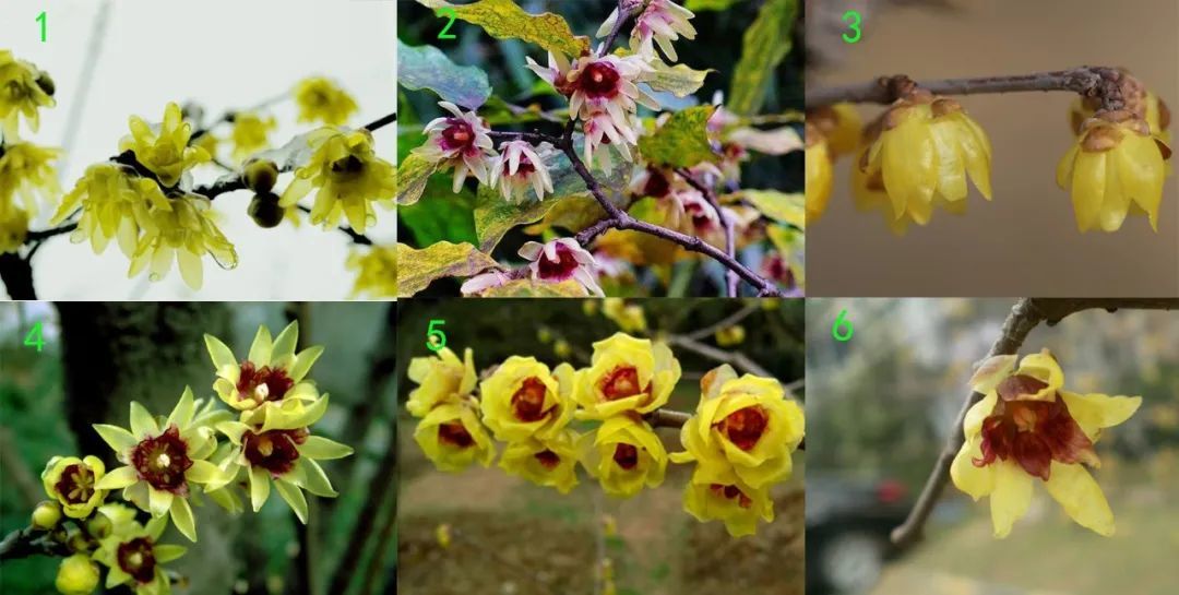 从1~6分别是素心梅、磬口梅、金钟梅、狗牙梅、小花腊梅、虎蹄梅。
