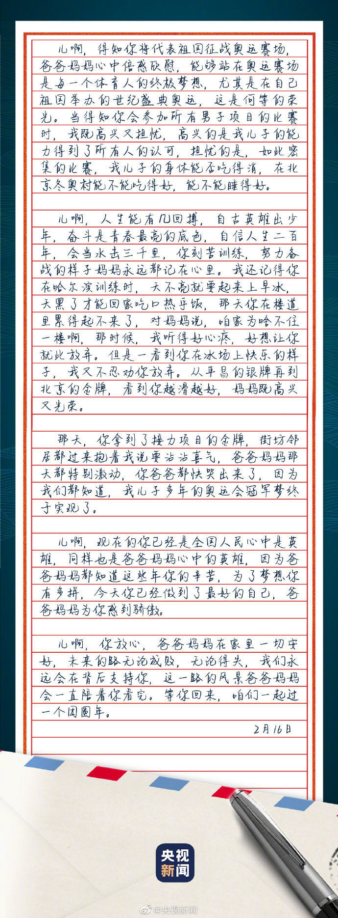 信中提到,任子威夺冠后,街坊邻居都过来拥抱李艳说要沾沾喜气,“你爸爸都快哭出来了,因为我们都知道,儿子多年的奥运会冠军梦终于实现了。 ”