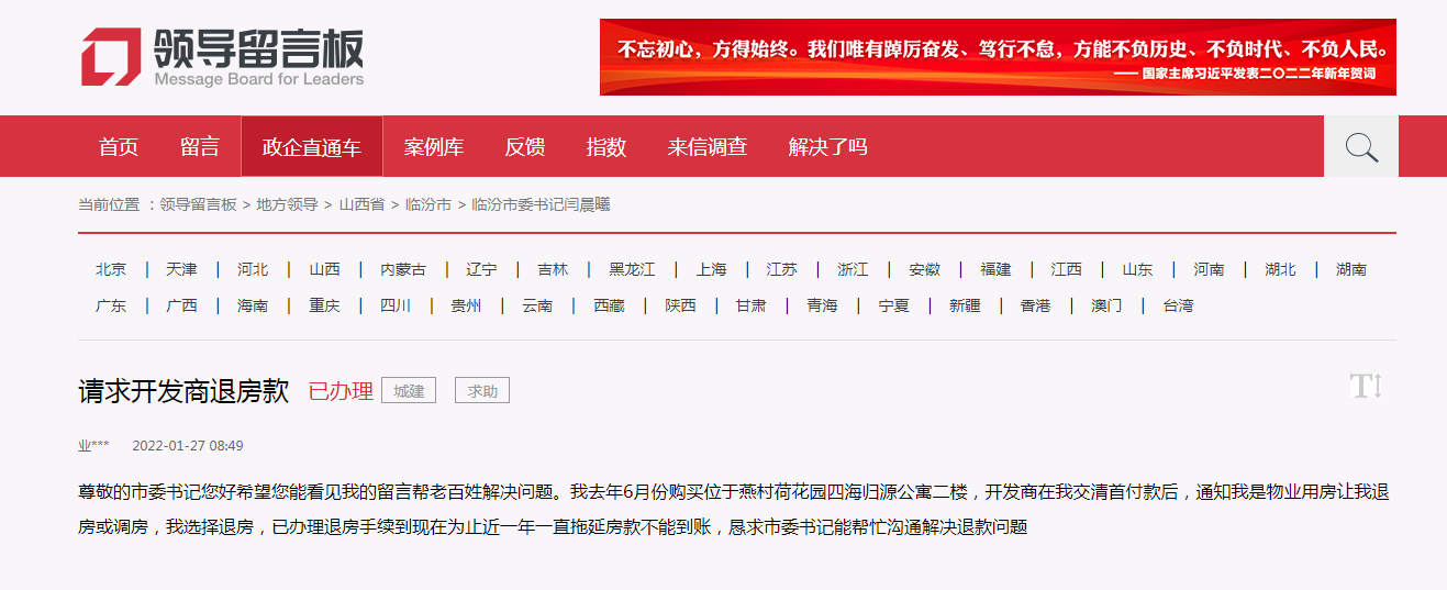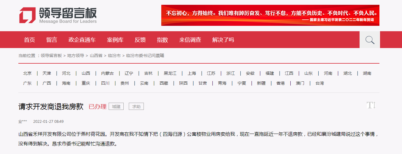 尊敬的市委书记您好希望您能看见我的留言帮老百姓解决问题。我去年6月份购买位于燕村荷花园四海归源公寓二楼,开发商在我交清首付款后,通知我是物业用房让我退房或调房,我选择退房,已办理退房手续到现在为止近一年一直拖延房款不能到账,恳求市委书记能帮忙沟通解决退款问题
