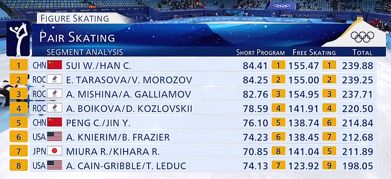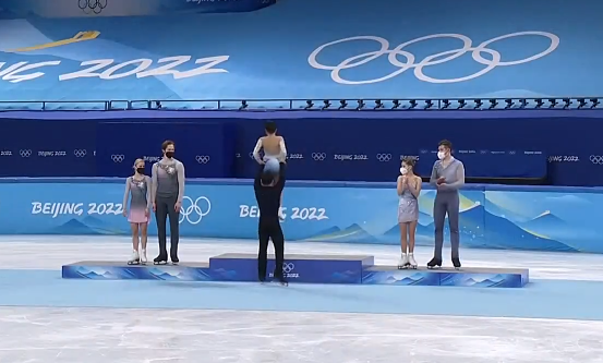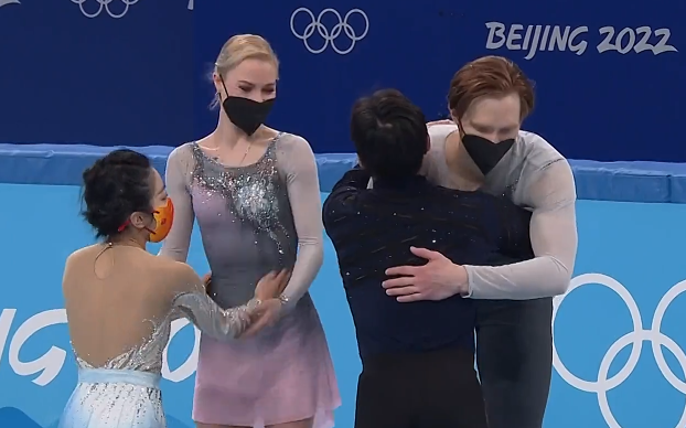 赛后,隋文静/韩聪非常有风度,先和两对俄罗斯奥运队组合拥抱致敬,塔拉索娃/莫罗佐夫、米什娜/加利亚莫夫分获银铜牌!值得一提的是,亚军组合塔拉索娃/莫罗佐夫并不开心,毕竟,他们仅输了0.63分。
