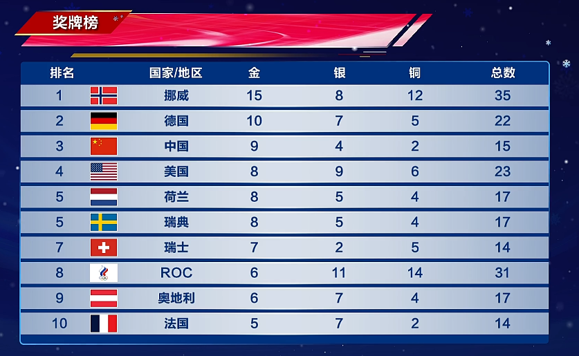 在奖牌榜上,中国队达到9金,排名第3!仅次于挪威和德国,这是了不起的成就。此外,中国队超越了美国队,后者排名第4!