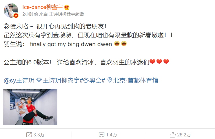 19日,柳鑫宇发博晒出自己又一次公主抱羽生结弦,并称很开心再见我的老朋友!虽然这次没有拿到金墩墩,但现在咱也有限量款的新春墩啦!