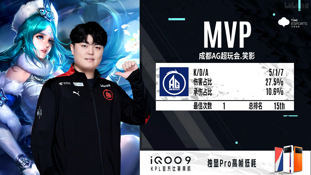 本次比赛后,成都AG两战两胜,跃居A组第一。中单位笑影的王昭君更是没有惧怕连败的魔咒,在对方拿出盾山时,果断使用王昭君进行反克制,效果极佳。