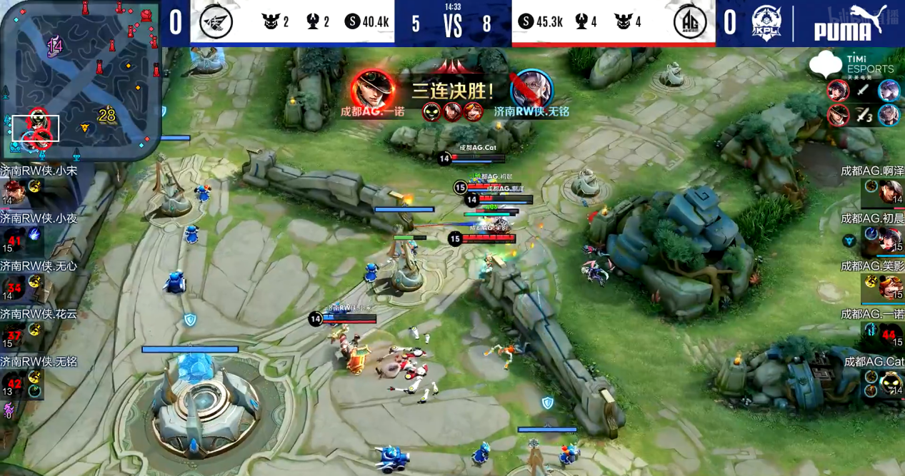 第1局比赛开局4分钟,济南RW侠的姜子牙弹弓体系率先压掉笑影沈梦溪半血,随后花云一剑跟上,收下人头拿下一血。5分钟时Cat的太乙真人控到济南RW侠的打野镜,初晨娜可露露战机起飞,收下镜的人头。中期13分钟,成都AG对济南RW侠打出一换三,并借势推掉了济南RW侠中路一塔和二塔。借助太乙真人的高容错率,成都AG并未撤退,继续往前压,仅14分钟就完成对济南RW侠的翻盘。