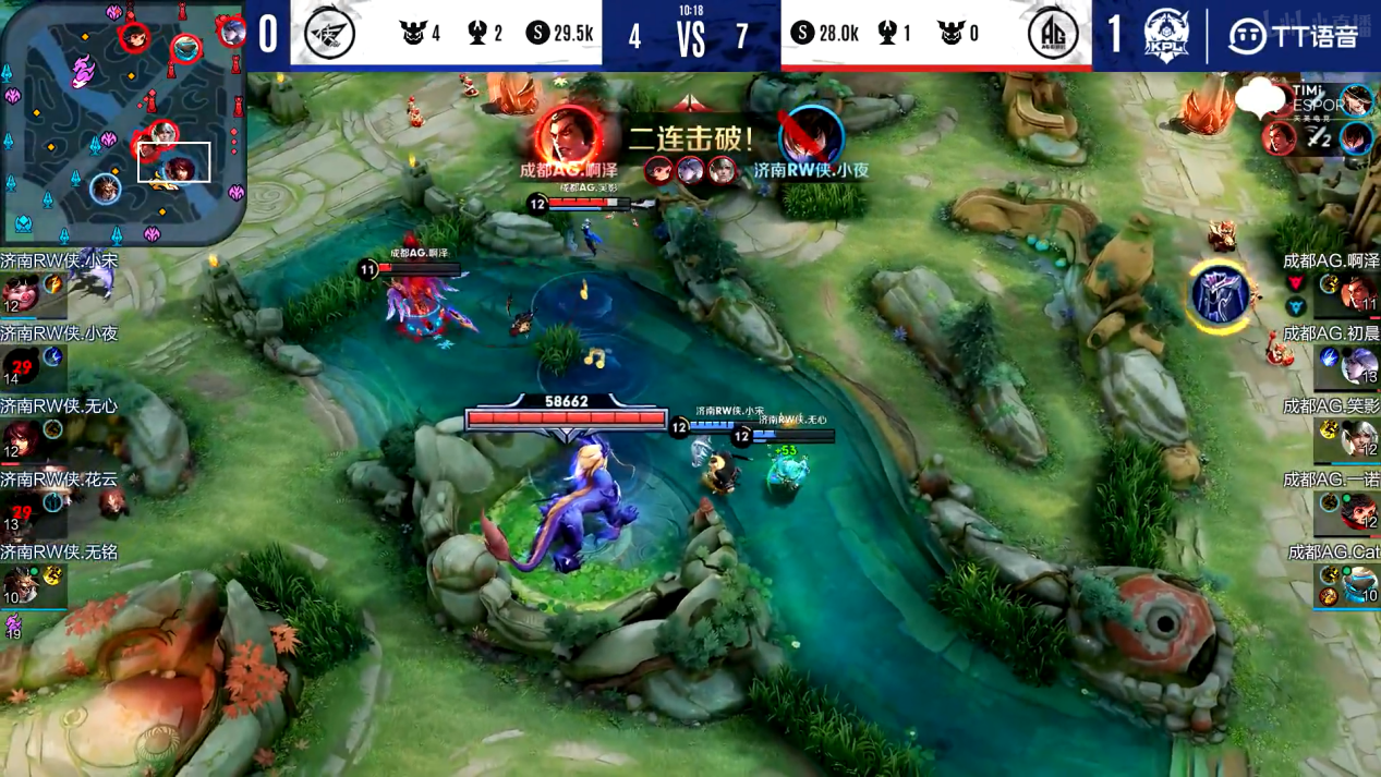 第2局比赛,前期济南RW侠的打野澜状态极佳,先行控下暴君以及先知主宰。15分钟,济南RW侠再次控下暗影主宰,推掉了成都AG的中路二塔,扩大了比赛优势,在后期团战中,尽管成都AG拿下了风暴龙王,推掉了济南RW侠的上路高地。但26分钟的龙王团战,济南RW侠完成3换5,实现了翻盘。