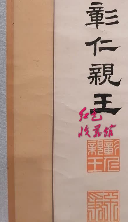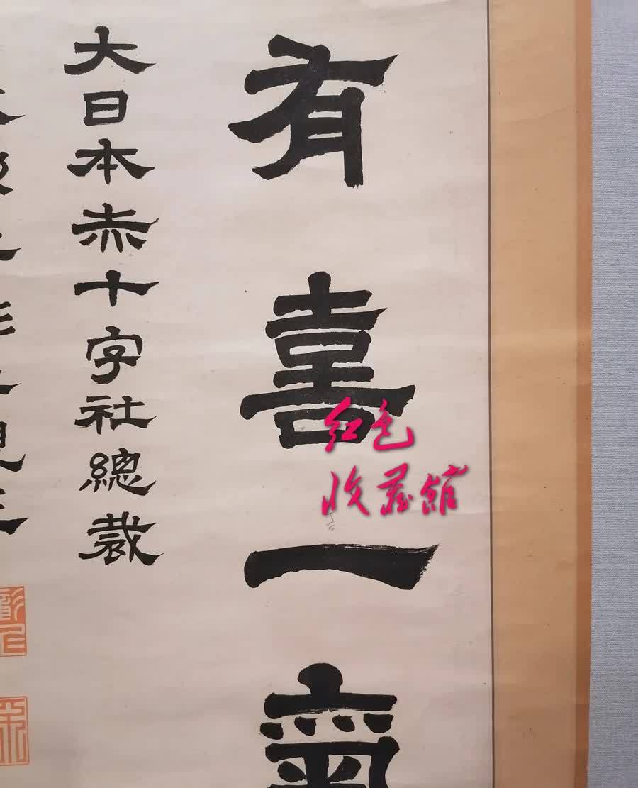 收藏古玩我一般都会选择一个特殊的角度去进行评估,也就是藏品有什么与众不同的地方,物以稀为贵嘛,通俗来说就是有没有卖点。这幅作品单纯从书法的角度来说,就已经让人爱不释手了,真的有眼前一亮的感觉。“万邦皆有喜 一气素无私”,篆隶结合,以韵取胜,充满了禅意;仁和味十足,仿佛世界上已经没有了杀戮和伤害,各国人民都能和平相处,天下从此一片太平景象;落款为“大日本赤十字会总裁 大勋位彰仁亲王”,一看就是身份极为显赫,让人很明显的感觉到那种皇族气场,特别是纵观整个布局,加上硕大的亲王印章,确实令人震撼,实在是难得一见的珍品。最有意思的是左下方有两方钤印,分别是“彰仁亲王”和“不争”,这“无私”和‘不争’简直是充满了讽刺意味,由他这样表达出来,实在是太滑稽了,苦心积虑跑到中国来烧杀劫掠,这是“不争”吗,这是赤裸裸的“要争”、“抢争”、“杀争”、“多争”,还贪得无厌。