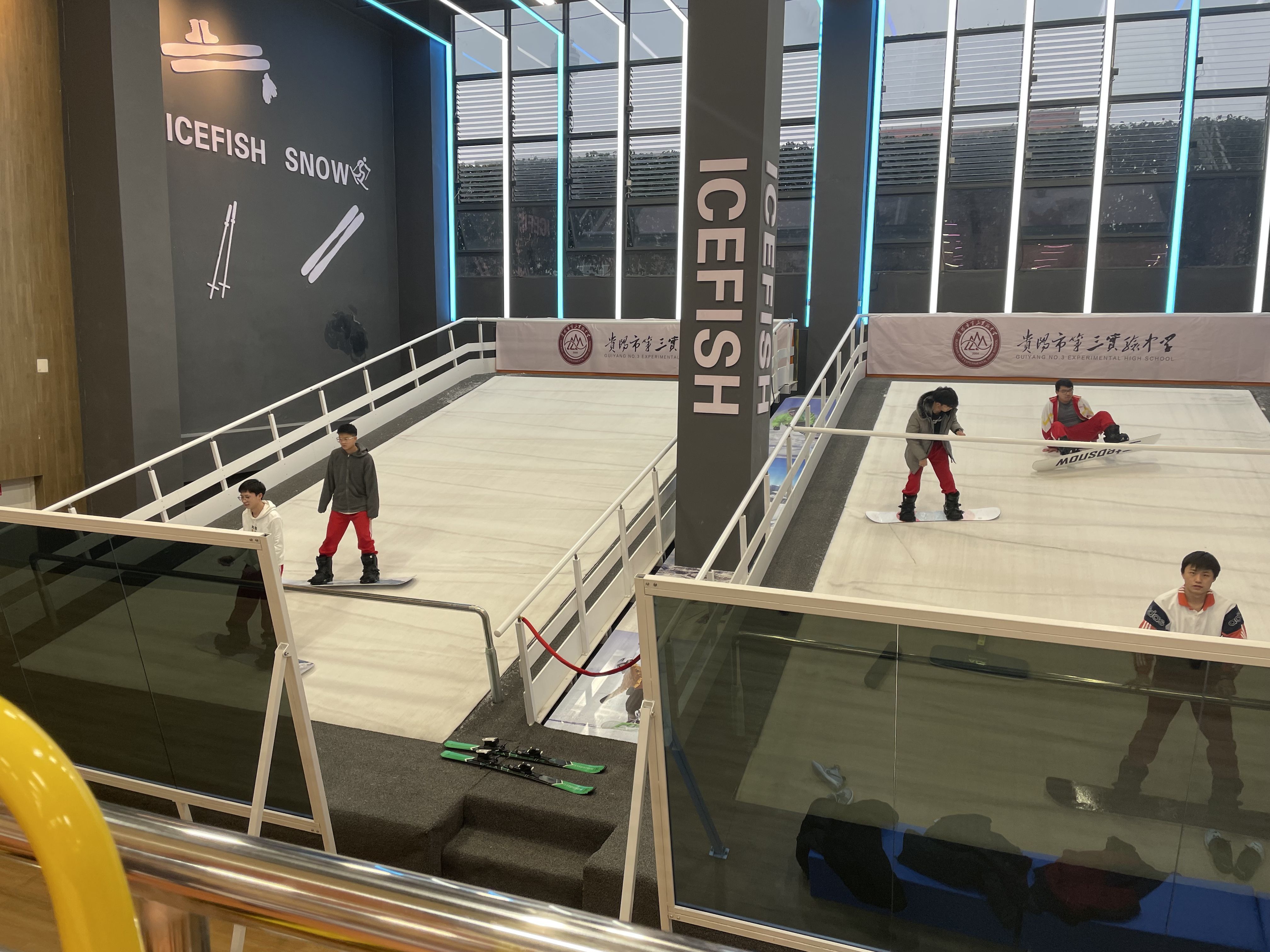 2020年,学校投资数百万元建起了专业的“冰雪馆”作为训练场地,除了比赛规格的陆地冰壶滑道,还修建了室内滑雪场,引进了两台长9.5米、宽4.8米的大型室内旱雪机,机器通过控制传送带的速度和角度,让旱地滑雪体验变得非常真实。2021年10月,包含室内滑雪和陆地冰壶在内的“冰雪模块”选修课登上了贵阳市第三实验中学的课程表。