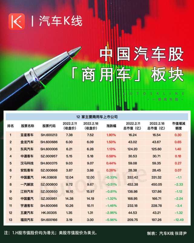 2022年第7周,12家商用车板块涉及的13支个股整体涨跌参半,一周股价平均下滑0.58%,市值累计缩水20.67亿元。
