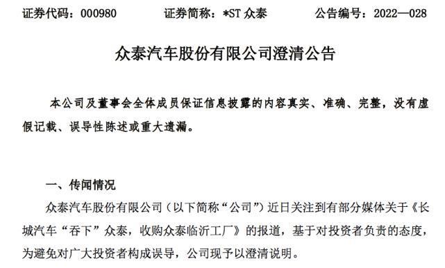 2月18日晚间,众泰汽车发布一则澄清声明,针对长城汽车收购众泰临沂工厂一事,表示公司及下属江南临沂分公司、卓泰汽车销售公司,均未与长城汽车签署过任何战略协议。