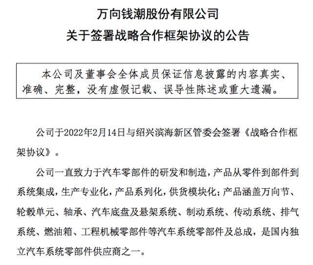 2月14日,万向钱潮发布公告称,公司与绍兴滨海新区管委会签署《战略合作框架协议》。