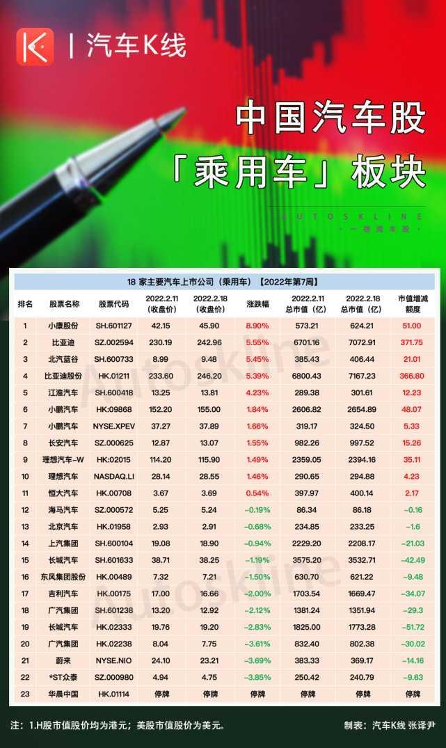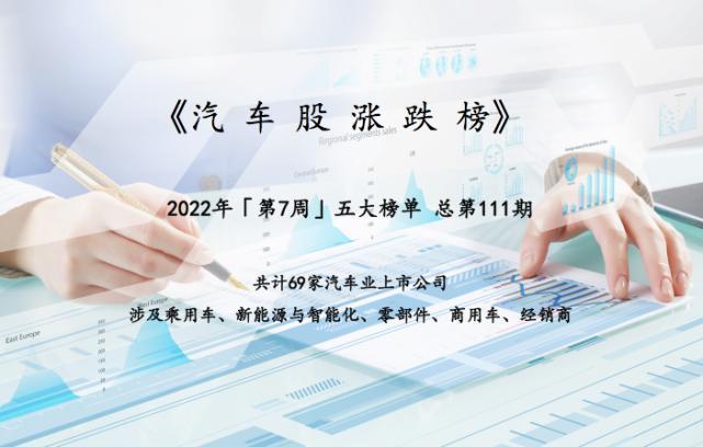 2022年第7周,(乘用车)整车板块18家上市公司股价平均上涨0.7%,市值增加603亿元,其中股价上涨和下跌的股票各11支。