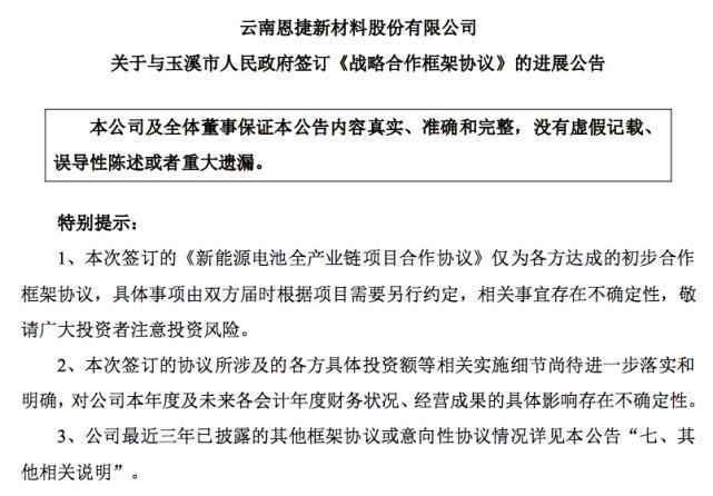 2月16日,恩捷股份发布关于与玉溪市人民政府签订《战略合作框架协议》的进展公告,三家锂电上市公司将联手投资超500亿元,在云南省玉溪市布局新能源电池产业项目。
