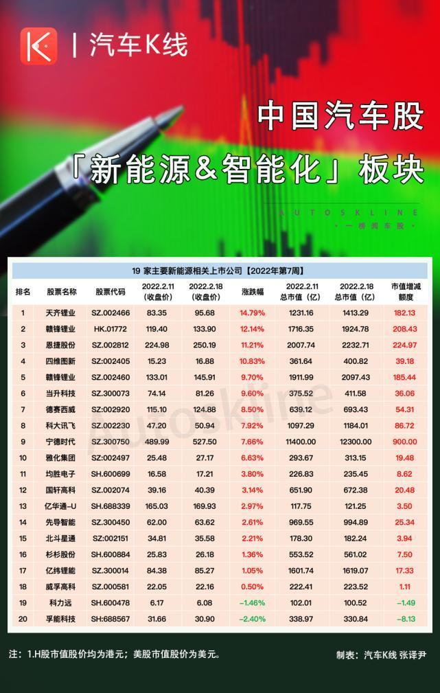 2022年第7周,19家新能源&智能化相关上市公司涉及的20支个股整体以涨为主。其中,股价增长的个股达18支,下滑仅2支,一周股价平均增长5.64%,市值累计增长1975.51亿元。