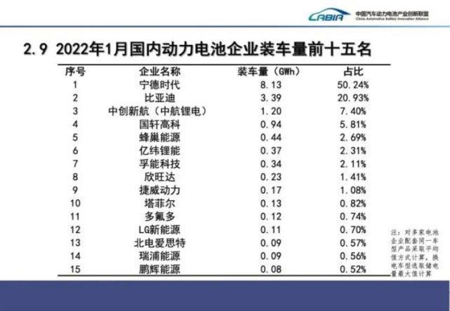 根据中国汽车动力电池产业创新联盟发布的数据,1月,宁德时代以50.24% 份额领先,比亚迪以20.93%份额排名第二,中航锂电以7.40%份额排名第三,之后依次是国轩高科、蜂巢能源、亿纬锂能、孚能科技、欣旺达等。
