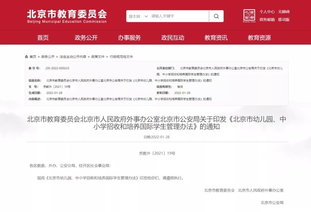 北京市三部门联合印发《北京市幼儿园、中小学招收和培养国际学生管理办法》(下称“办法”),对国际学生工作的体制机制和运行管理等方面进行了更新。