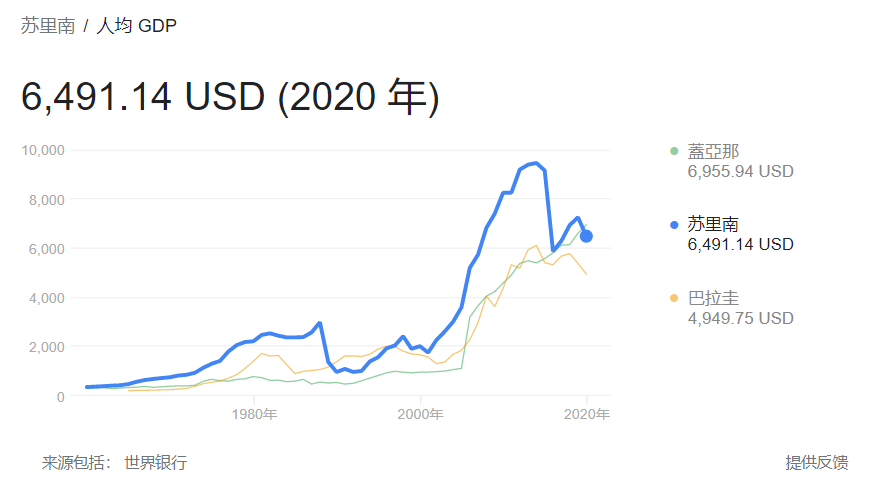 在此后的20年里,荷兰政府不仅没有等来苏里南的独立,反而被自己的殖民地反向各种“薅羊毛”。苏里南在70年代的人均GDP实现暴涨,达到了1300美元。苏里南作为没有完全独立的殖民地,在当时的生活水平已经远超自己先独立的“兄弟”圭亚那,甚至和石油资源丰富的委内瑞拉持平。