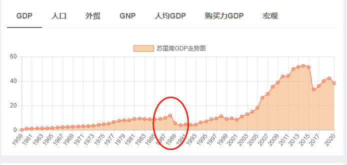 ▲苏里南GDP在80年代出现断崖式下跌(单位:亿美元)