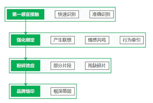 进一步的作用是通过符号,使目标产生联想、情感共鸣、甚至是行为牵引。从而达到,每一次的接触都是强化和深入的关系绑定。更深入可以达成的作用是粉碎效应,即,通过片段、部分或残缺的碎片也能准确识别符号所代表的信息。最终达成的目的是品牌烙印,此时的符号,已经成为独特的、根深蒂固的符号理念,深植目标群体的心智。