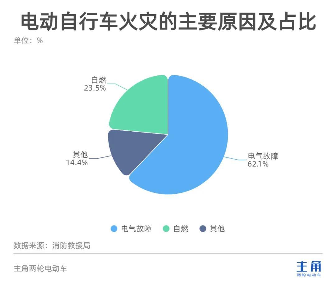 数据显示,2021年前10个月,全国发生电动自行车及其电池故障引发的火灾共1.4万余起。而根据消防救援局统计,电气故障、自燃是造成电动自行车火灾的主要原因,分别占比62.1%、23.5%。