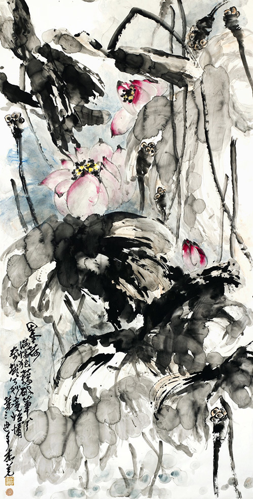 在当代画家中,以画荷闻名于世的当属张大千了,他画荷直追八大山人和石涛的笔法气韵。张大千深谙八大用笔章法气势,并常常临塘观察、写生,取法自然。八大画荷多用湿笔,而张大千兼用渴笔。湿笔墨活、浓郁、深厚、凝练而不滞,渴笔飞白、苍劲、流畅、华滋而不枯。张大千的技巧兼工笔带写意,采用淡彩、水墨、泼墨、泼色等方法,能够画出荷花的各种风姿。