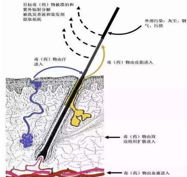 与尿液、血液等体液的毒品留存机理不同,一般来说,毒品进入毛发存在两种可能情况。一种是血液中的毒品在毛发生长过程中,进入毛发根部区域,当毛发长出头皮后,这些毒品在毛发中形成带状,以一定浓度出现在毛发上,受到毛发机制的保护而不会被外部环境清除或改变;另一种可能情况是可溶于水的毒品通过排泄进入汗液或皮脂腺,它们浸湿着毛发,可以在毛发从皮肤中长出时渗入毛发。