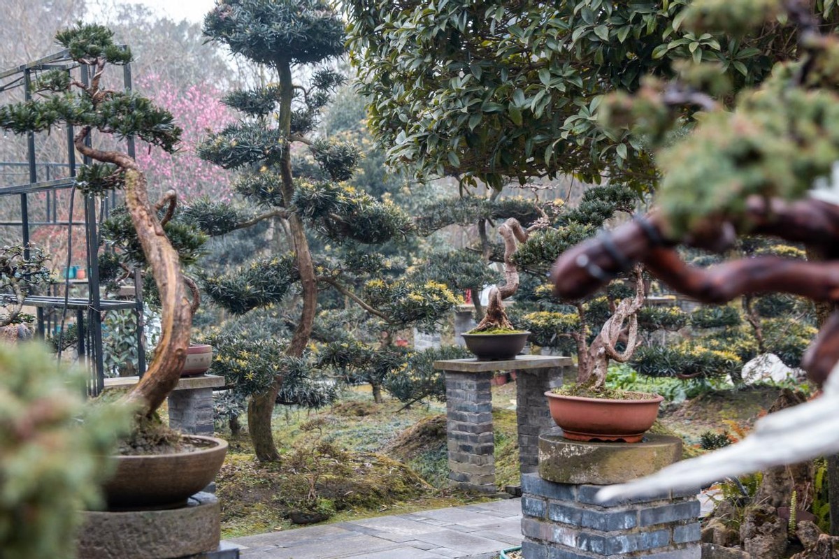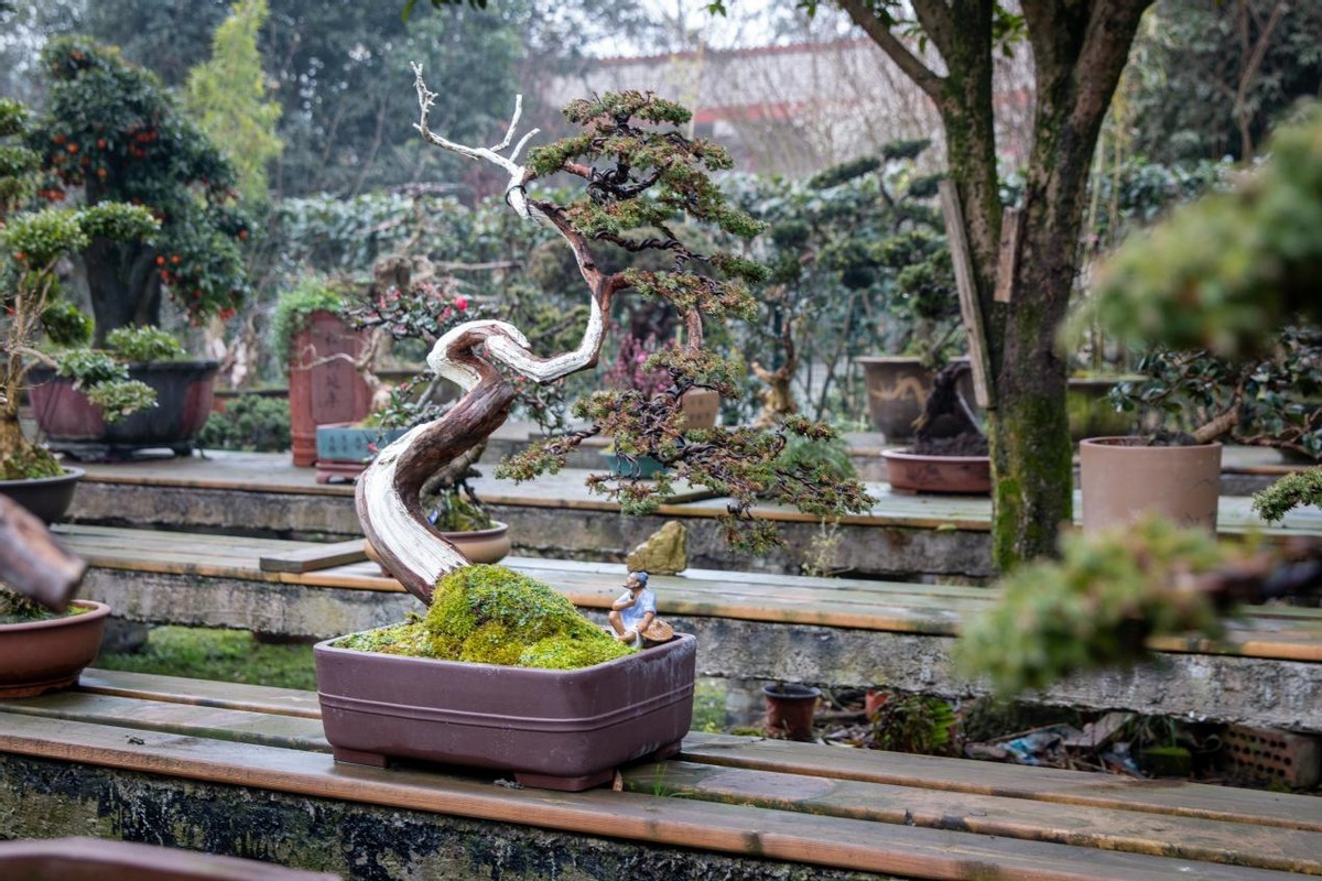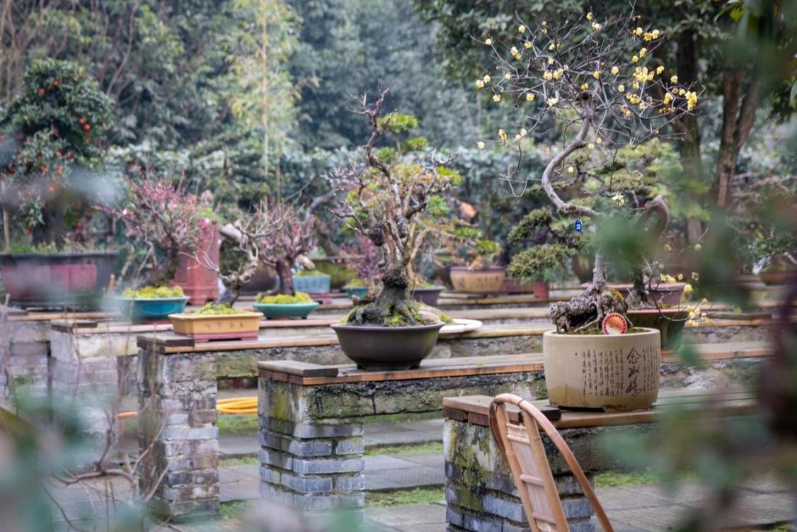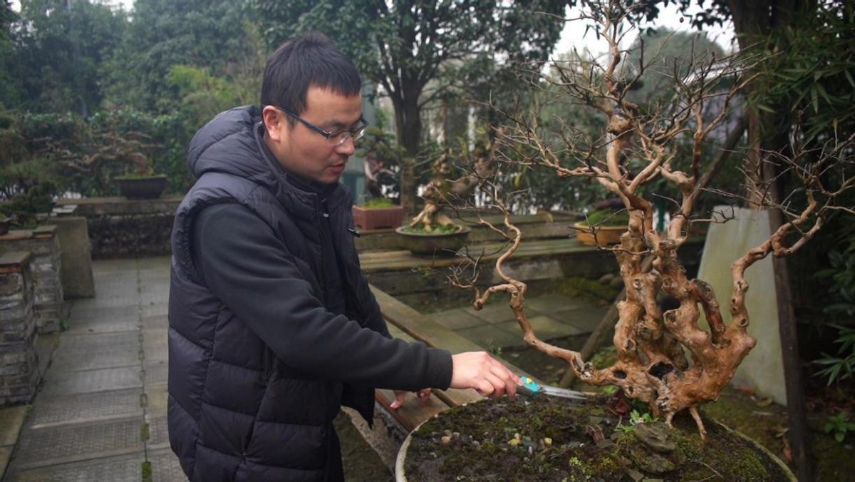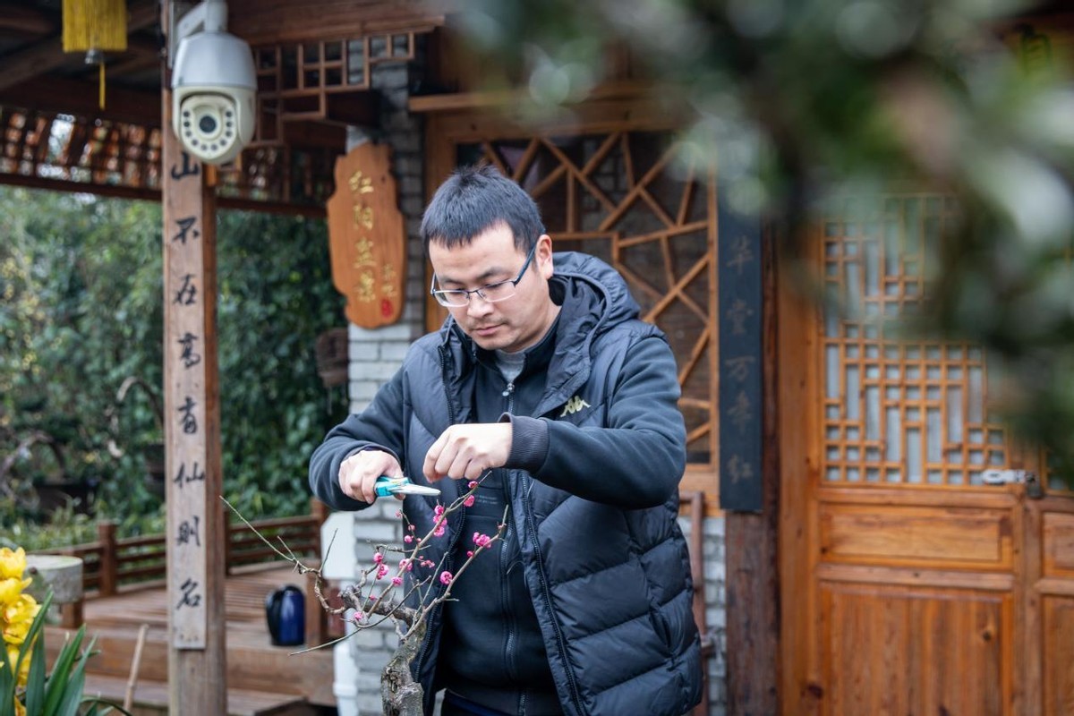 一处柴扉半掩的庭院中,今年36岁的陈宏宇正在为一株红梅盆景修剪枝丫。和百花村的大多数村民一样,陈宏宇8岁便开始跟随父亲学习盆景栽培技艺。2009年大学毕业后,他在成都一家市政公司任职,因为不甘于平凡岗位,加上自身对盆景的热爱,陈宏宇毅然决然辞掉工作,回到家乡从事盆景产业。