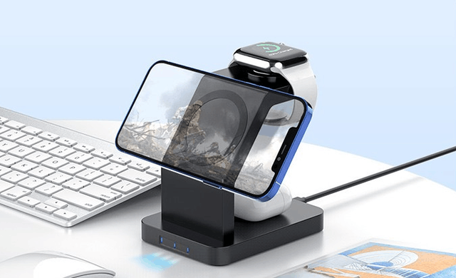 这绝对是同类型产品中功能颜值独具一格的一款磁吸无线充电器,不仅可以同时为手机手表耳机充电,也可以作为三者的收纳盒,出门一首抓,一个都不落。还可以作为手机支架,横屏竖屏都好用!