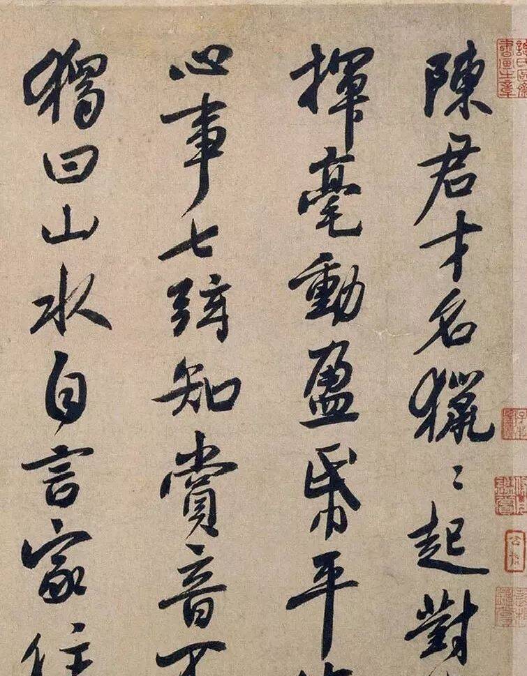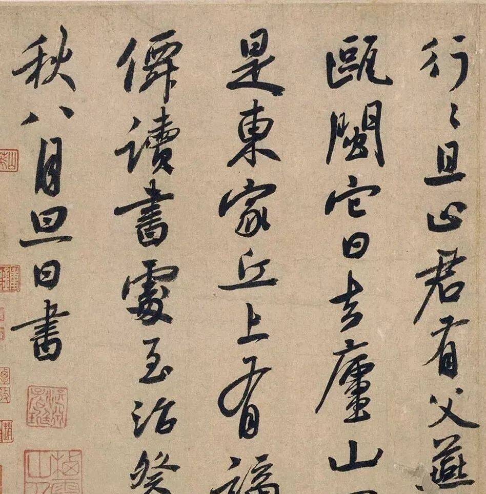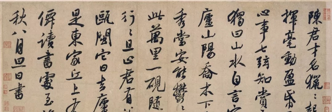 释文:陈君才名猎猎起,对客挥毫动盈纸。平生心事七弦知,赏音不独曰山水。自言家住庐山阳,乔木下有甲秀堂。安能鬱鬱久居此,万里一砚翱翔。行行且止君有父,燕赵瓯闽它日去。庐山不是东家丘,上有谪僊读书处。至治癸丑(丑字点去)亥秋八月旦日书。