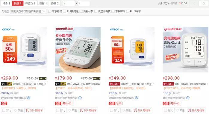 京东健康自营最大(按销量排名)的前4个血压计产品销量分别为200万+、300万+、200万+、300万+。