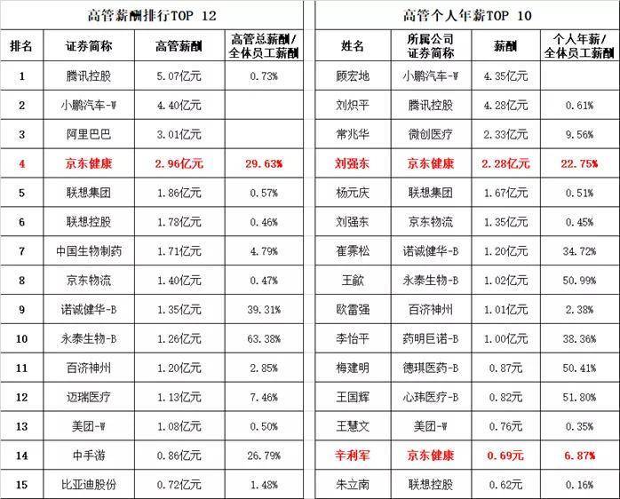 该榜单显示,京东健康的高管薪酬高达2.96亿元,高管薪酬占全体员工薪酬的29.63%。其中,刘强东年薪2.28亿元,个人年薪占全体员工薪酬22.75%;辛利军年薪0.69亿元,个人年薪占全体员工薪酬6.87%。(注:刘强东现任京东集团董事局主席兼CEO,京东健康实际控制人;辛利军现任京东零售CEO、京东健康非执行董事,原京东健康CEO、执行董事)