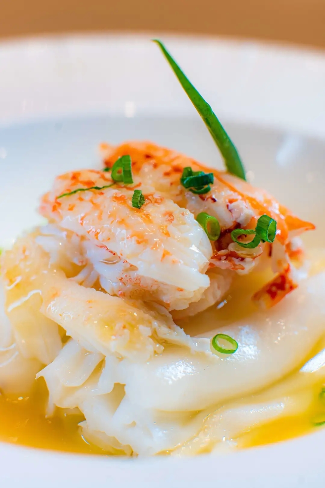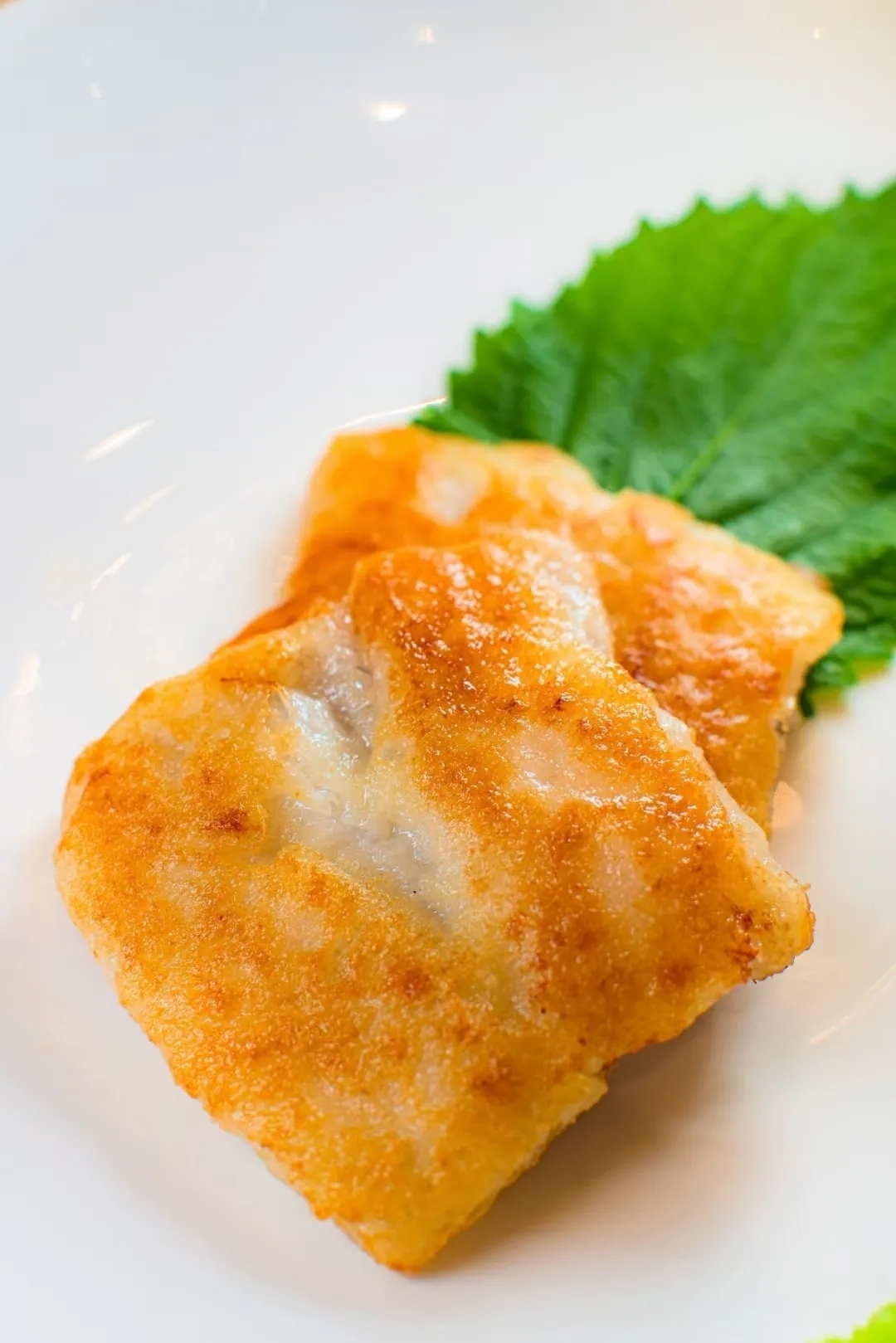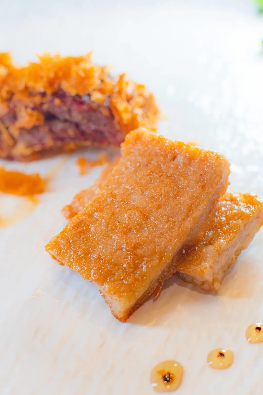 芹香焗龙头鱼:聂璜在《海错图》中说“龙头鱼,产闽海。巨口无鳞而白色,只一脊骨,肉柔嫩多水。”因为骨头太软,连狗都嫌弃,广府人称它为“狗吐鱼”,至于“九肚鱼”,纯属以讹传讹,哪来的九个肚子嘛?龙头鱼水分太多,嫩是它的优点,但也因为含水量大、脂肪含量少而鱼味不足,所以《海错百一录》这样描述龙头鱼:“殿鱼,海鱼之下品,食者耻之。腌市每斤十数文,贫人袖归”,连穷人都怕因为买了它而被人耻笑,所以藏在袖子里,不得不说古人的袖子真好用。如何扬长避短?御口福去其中间脊骨,拍上淀粉后香煎,再以芹菜入味。此法让龙头鱼的水分去掉了一些,但并不影响它嫩的一面——它的含水量确实太高了,蒸发掉一部分仍然很嫩;高温油煎,大分子的蛋白质分解为呈鲜味的小分子氨基酸,所以特别鲜美,弥补了龙头鱼味道寡淡的不足;外酥里嫩,矛盾的口感,给予美妙的体验。这是很粤菜的做法,精彩!