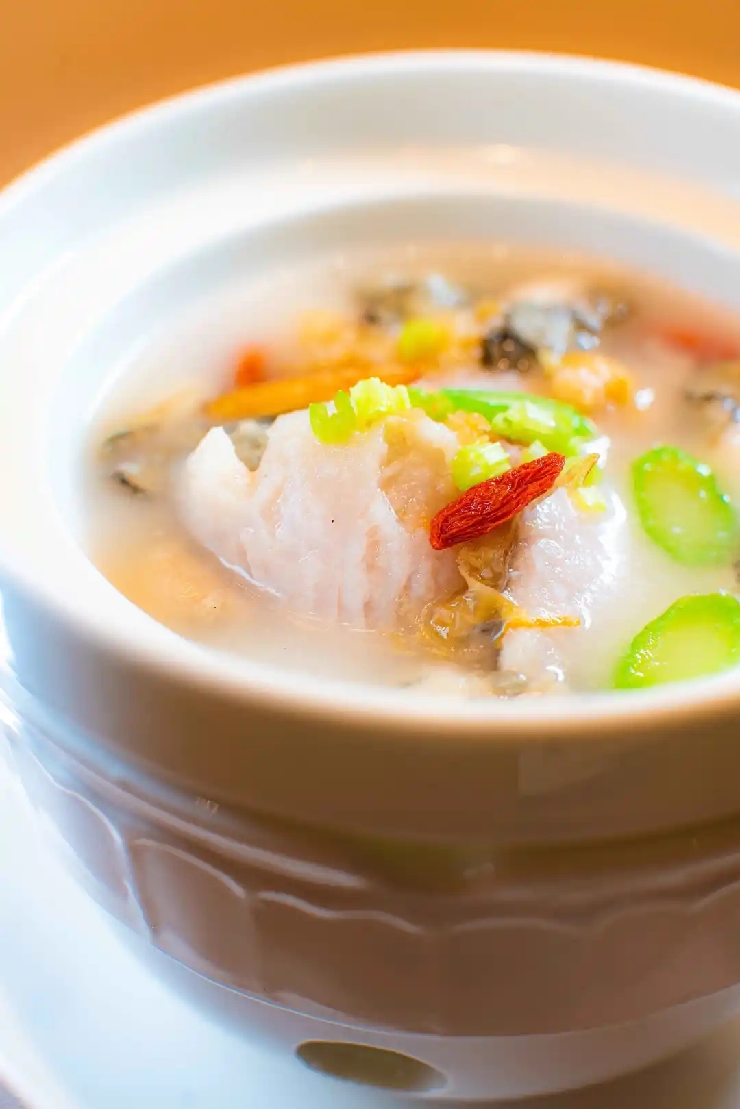 蚝仔粥水煮鹰仓片:广府人将中国鲳鱼叫鹰仓,以其嘴巴似鹰嘴之故,至于“仓”字,是对“鲳”的笔误。还有人叫它燕鲳,以其尾巴似燕子尾巴命名。福建人、潮汕人将这鱼叫“斗鲳”,以真大如船上洗碗的斗碗而命名,说的都是中国鲳鱼。这种鱼,肉质细嫩,脂肪含量多,鱼味很足,没有肌间刺,具备了一条优秀的鱼的所有优点,价格也与东星斑接近。潮州菜的做法通常是清蒸、香煎、堂灼或者青瓜煮,只要新鲜,怎么做都好吃。御口福用粤式的烹饪方法,把粥熬至不见米粒,淀粉完全糊化,形成只有水没有米的“粥水”,将鲳鱼切厚片后用粥水灼熟,糊化的淀粉把鲳鱼包住,鲜味和各种风味物质不会跑出来。不仅如此,还用潮汕的小珠蚝加到粥水中,既给鲳鱼提鲜,又让粥水鲜味十足。至于蚝,就可以不用吃了,夏天的蚝进入夏眠,并不肥美,仅有的那点鲜味,已经全部奉献给粥水。这个粤式的演译,绝妙!